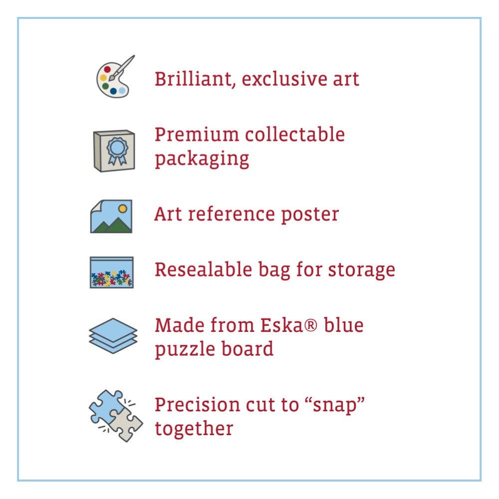 Boardwalk personal puzzles are made with premium Eska® puzzle blue board produced from 100% recovered paper. Each puzzle comes in a collectable box with magnet close, includes a full-color reference poster, and contains resealable bag for puzzle storage. Boardwalk traditional puzzles are precision cut to fit tightly and “snap” together.
