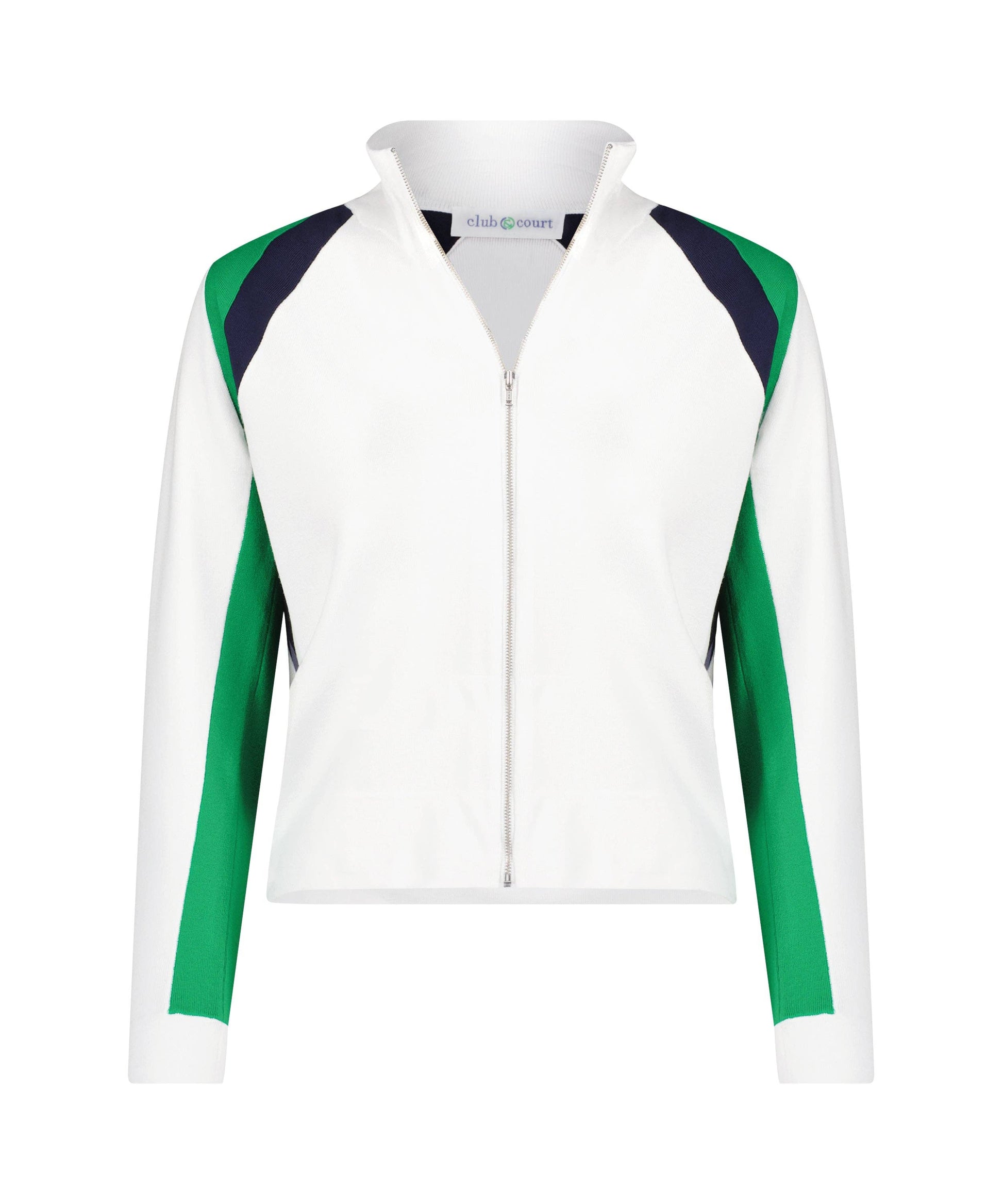 Our All-Sport Club Sweater elevates your look with its luxurious stretch cotton, classic kelly green and navy accents, and silver hardware zipper. Finished with a feminine sleeve length, this style has a flattering feel to it. Enjoy superior comfort while looking fashionably cool in this soft and sporty sweater.