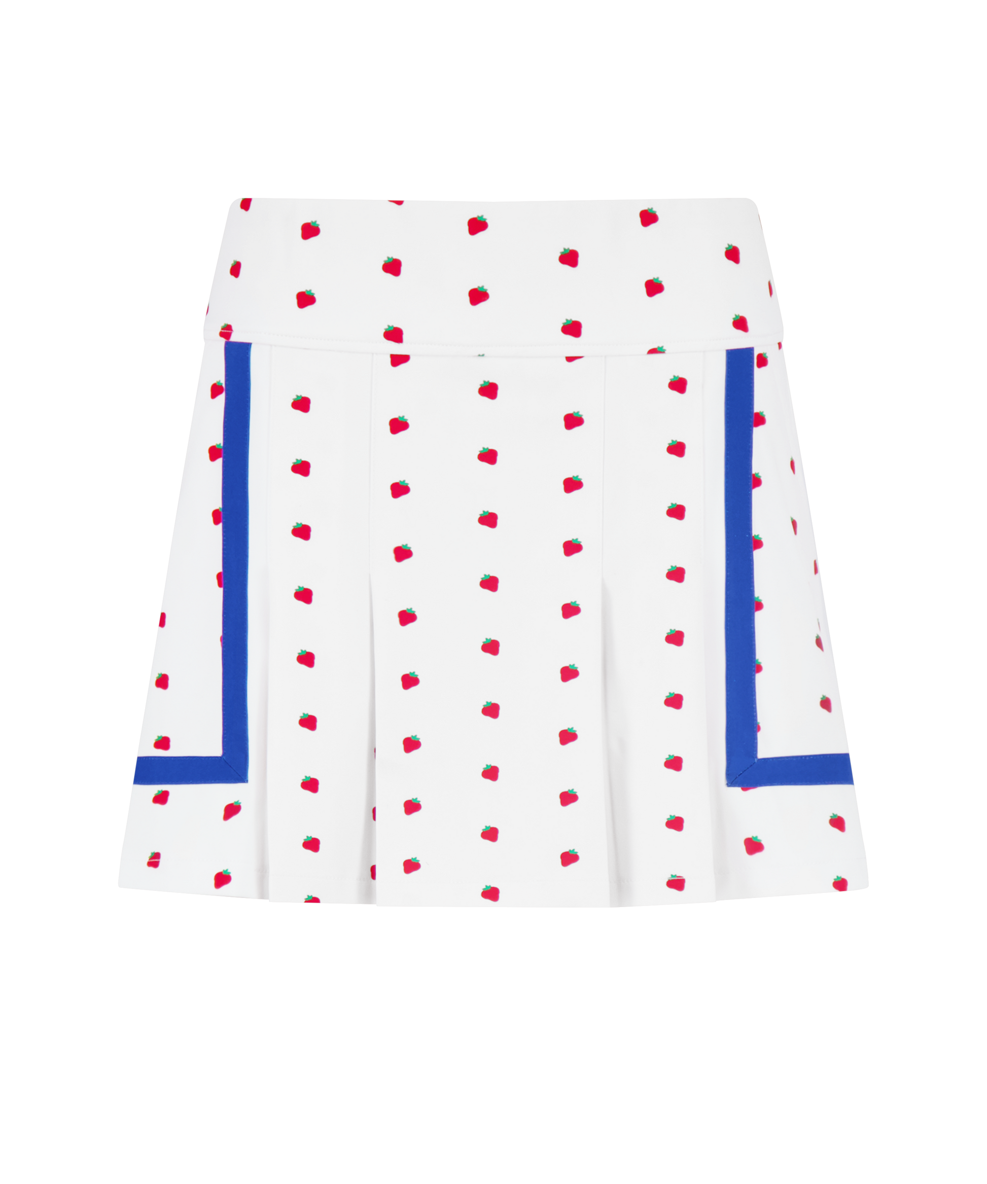 Level up your golf attire with this performance twill skort. Introducing two new color ways: Bright White with Blue Folly Floral Trim and Strawberry Print with Cadet Blue Trim. Meticulously crafted with an ideal-length hem and built-in stretch shorts, this skort merges style with practicality. Multiple pockets, including two side pockets and a back zip pocket, offer ample storage. The generous waistband and thoughtful pleating create a graceful line, while UPF30 protection shields you on sunny days.
