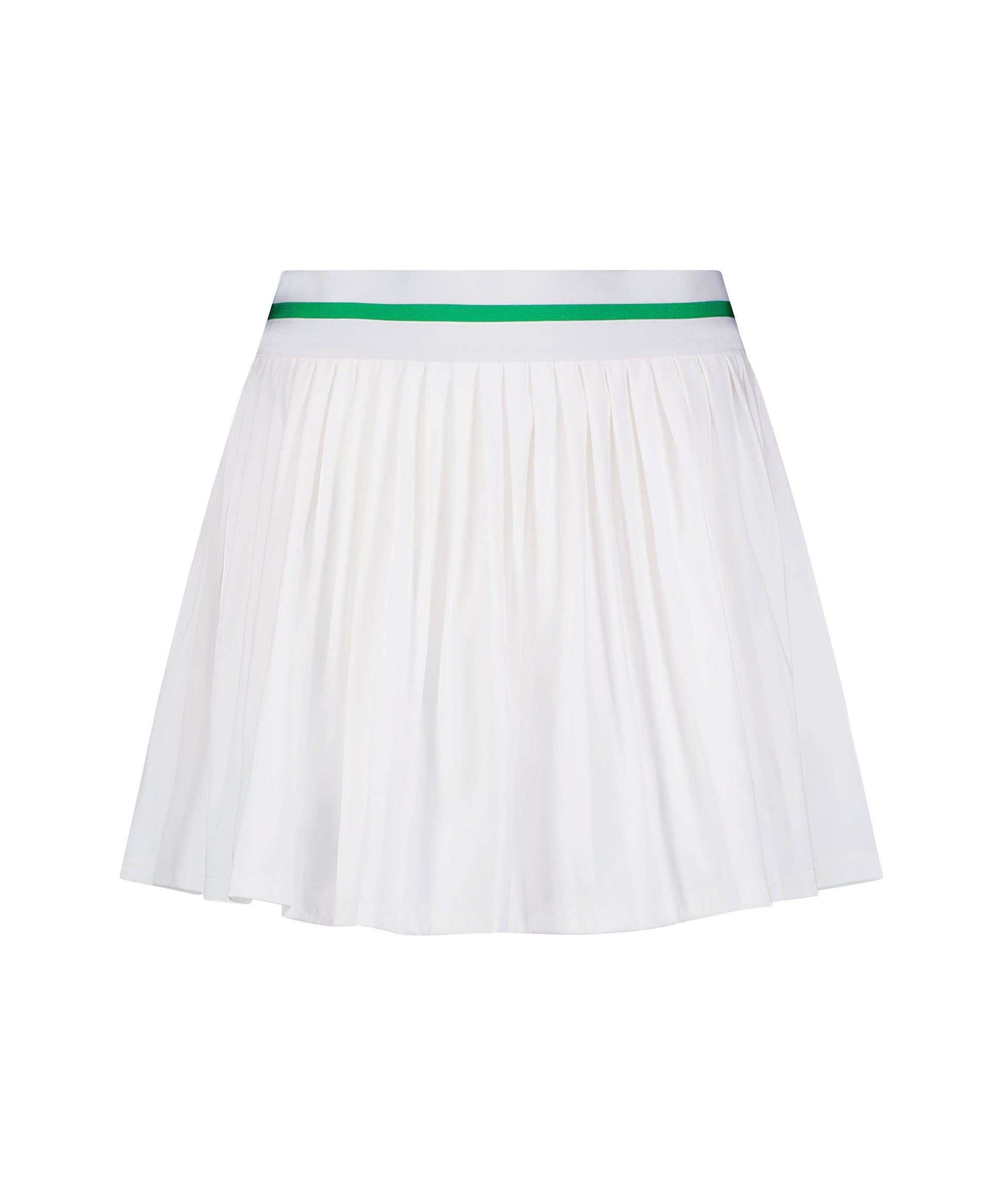 The Cricket Skort is perfect for any occasion. Now in two color ways: White with Kelly Green Trim & White with Blue and Green Trim. Crafted from our club polyspan, this crisp white 15 1/4" skort is adorned with a beautiful contrast waistband. The accordion style pleats create a graceful silhouette that is perfect for an on and off the court look. The luxurious feel and elegant tailoring of this garment make it a stylish and sophisticated statement piece.