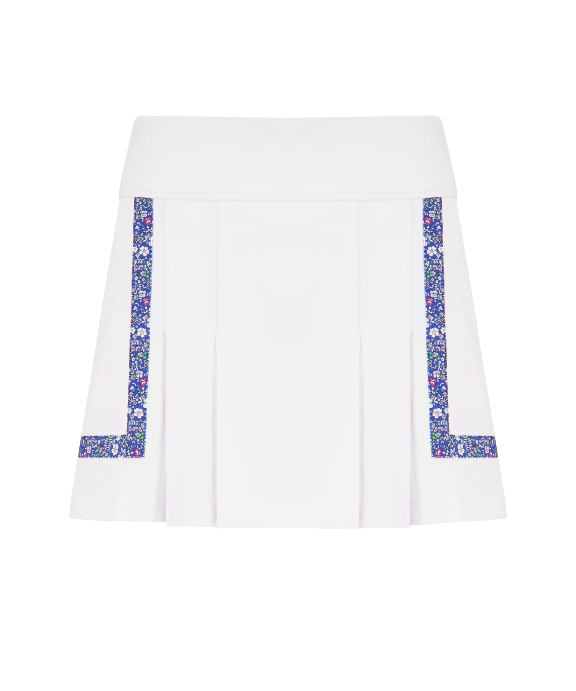 Level up your golf attire with this performance twill skort. Introducing two new color ways: Bright White with Blue Folly Floral Trim and Strawberry Print with Cadet Blue Trim. Meticulously crafted with an ideal-length hem and built-in stretch shorts, this skort merges style with practicality. Multiple pockets, including two side pockets and a back zip pocket, offer ample storage. The generous waistband and thoughtful pleating create a graceful line, while UPF30 protection shields you on sunny days.