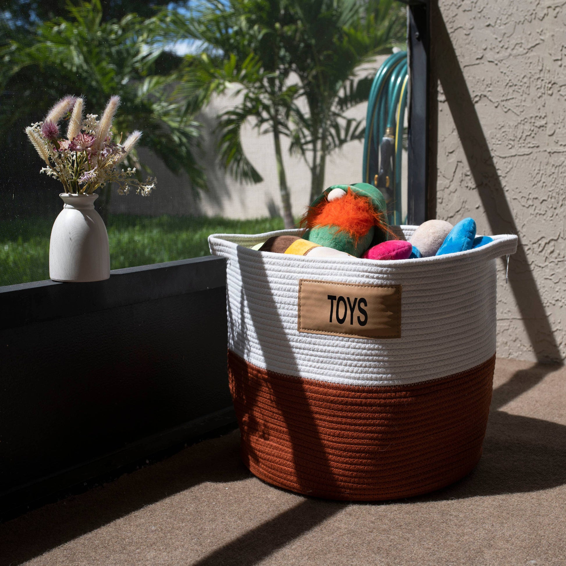 A stylish white and rust-colored cotton rope toy basket will be a great addition to your home's decor. This makes for an easy way to store your pet's toys and keep your space organized. The open-top allows your pet access to pick and choose what toy they want to play with.