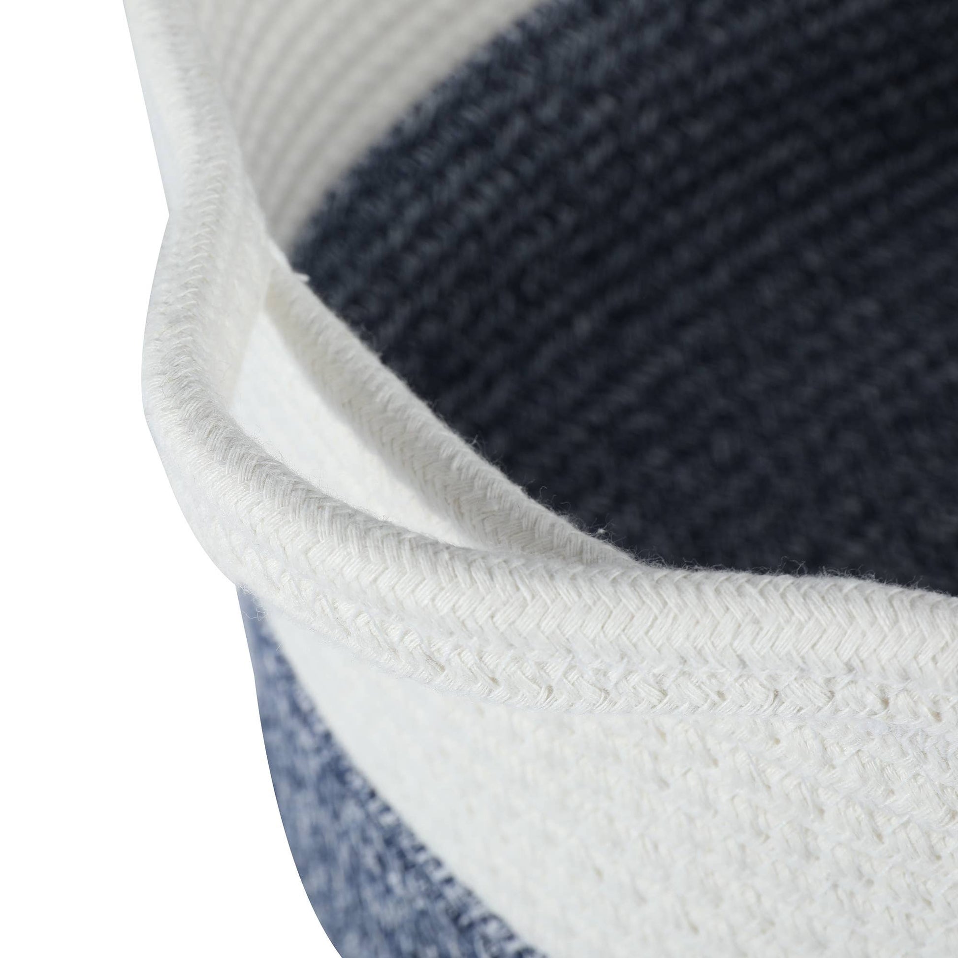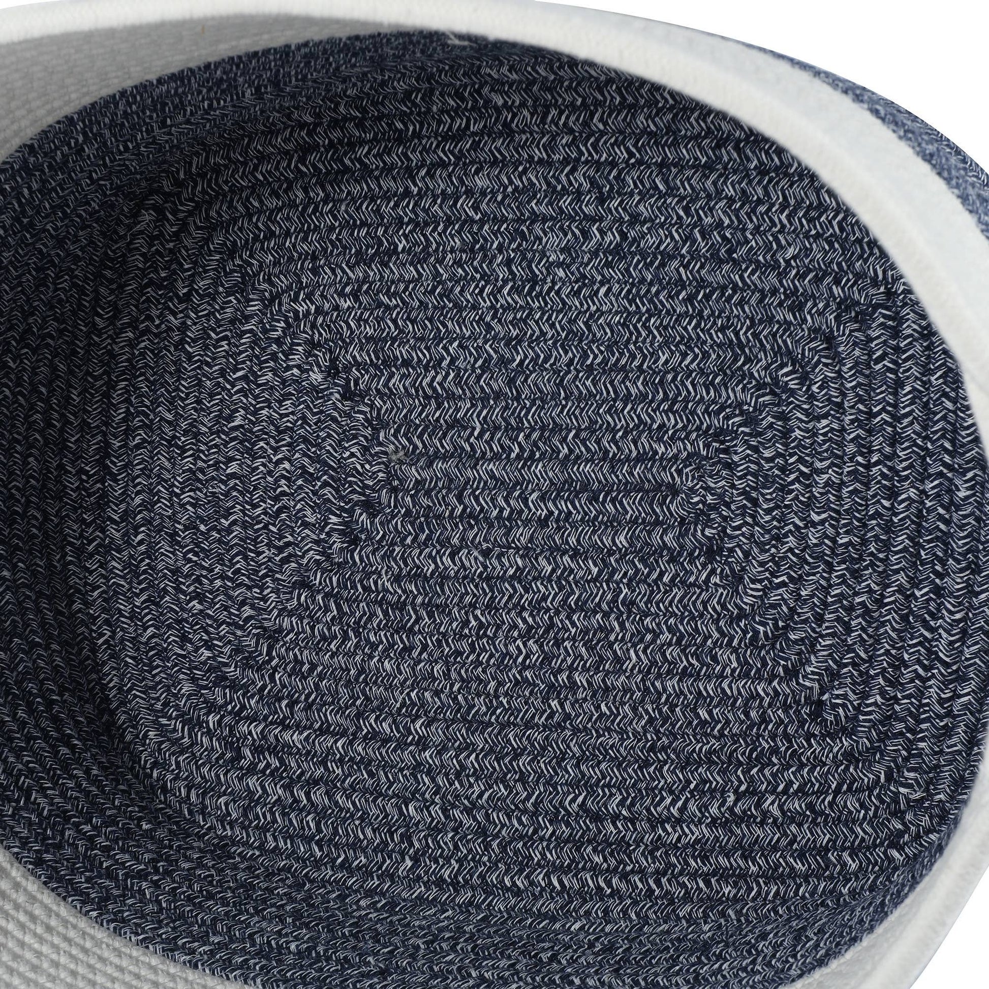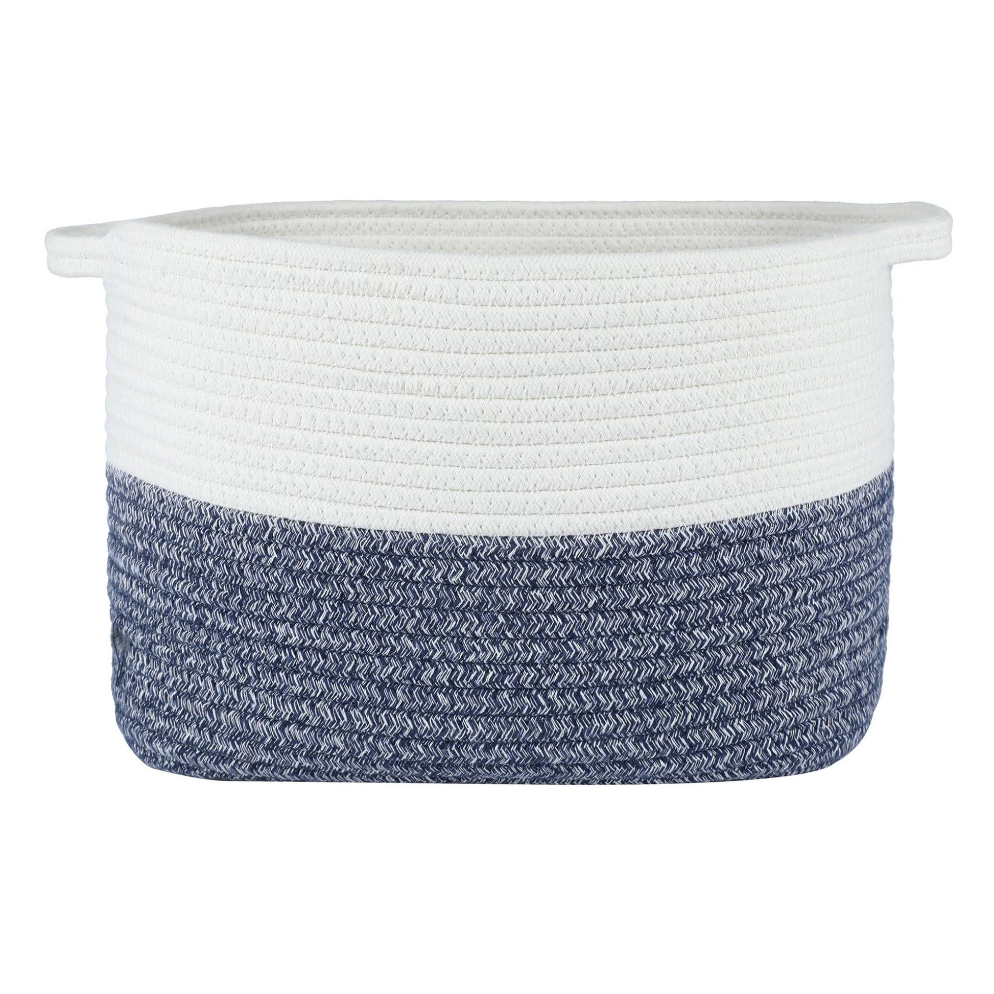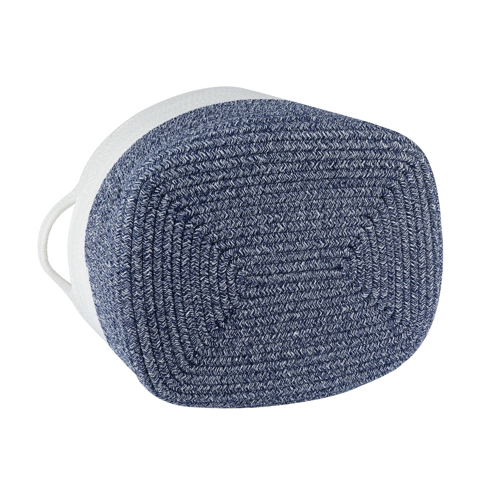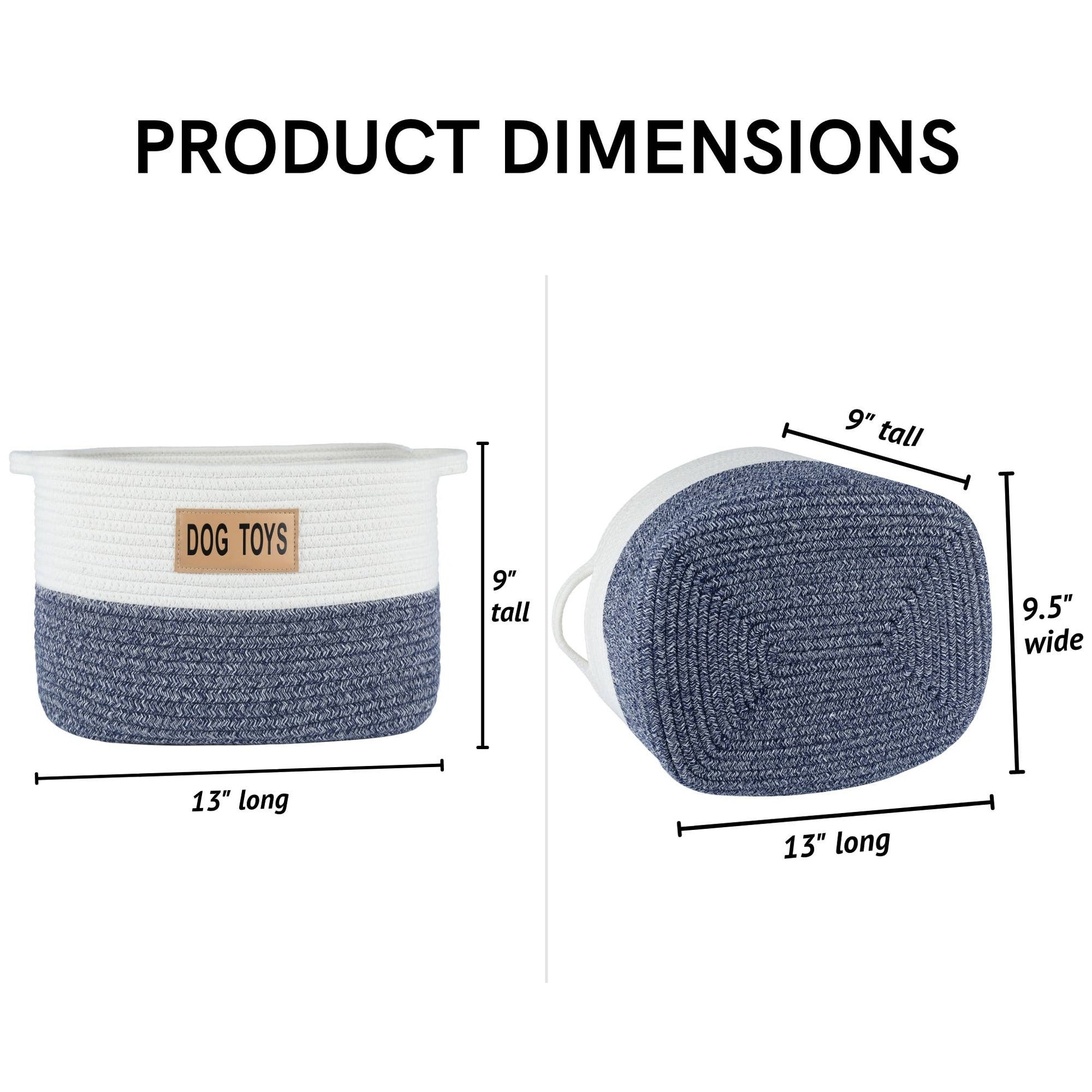 A stylish two-toned blue and white Rope Dog Toy Storage Basket will be a great addition to your home decor. This makes for an easy way to store your dog's toys. Top access allows them to pick and choose what they want to play with.