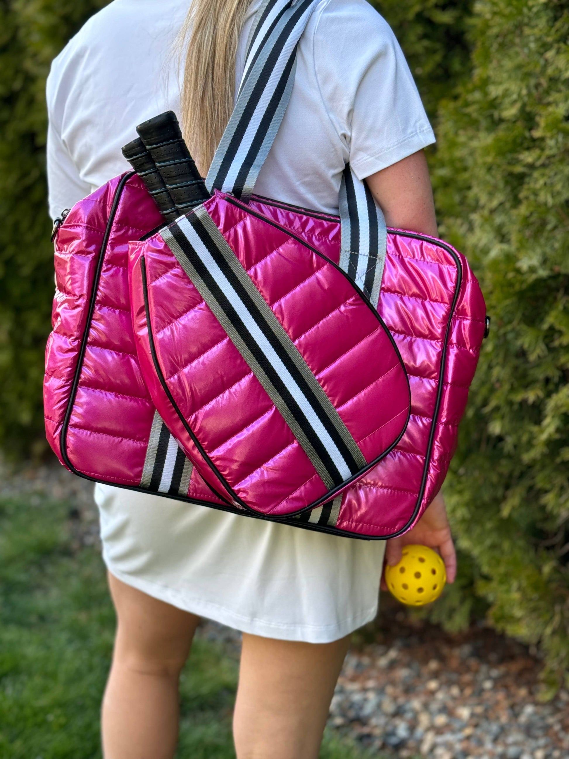 This premium puffer bag features a convenient outer compartment specifically crafted to securely hold your racquet (or 2!), while boasting a spacious internal storage capacity for all your extra gear and essentials.