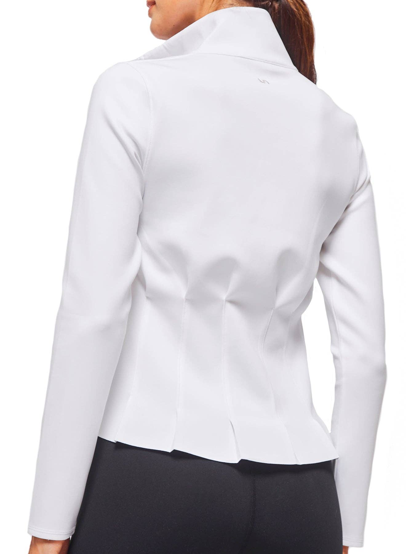 The Pleated Jacket is made of a lightweight scuba neoprene material with shaping pin-tucked pleats. It is based on our best selling Pleated Hoodie :D. This jacket is stretchy and fitted at the waist. Its slightly longer back also helps create a flattering look for your bum. Machine washable performance fabric makes this jacket perfect for active endeavors, though the styling makes it perfect for a wide range of active AND non-active outfits.