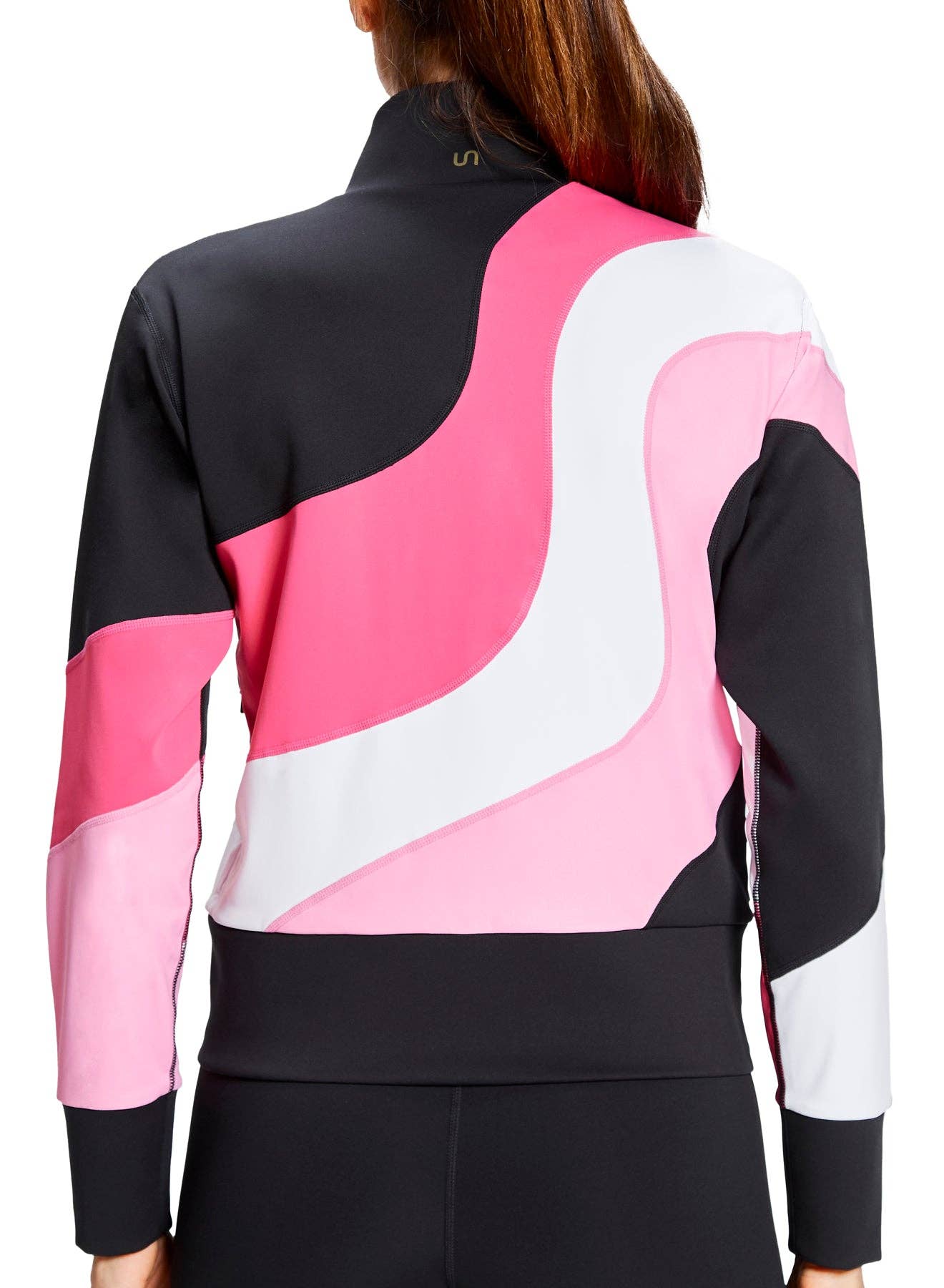Why wear a boring jacket when you can wear a Swirl Jacket? This new style features whimsical color blocked swirls with flat seam details to create a neat, crisp look. This jacket features side pockets with invisible zippers and is made of a lightweight scuba/neoprene and is fully lined in sweat-wicking activewear fabric, so it is easily machine washable. This style is as suited for working out as it is going out. It is designed to be a semi-fitted, hip length bomber with a funnel collar and runs true to size. If you are in between sizes, size up.